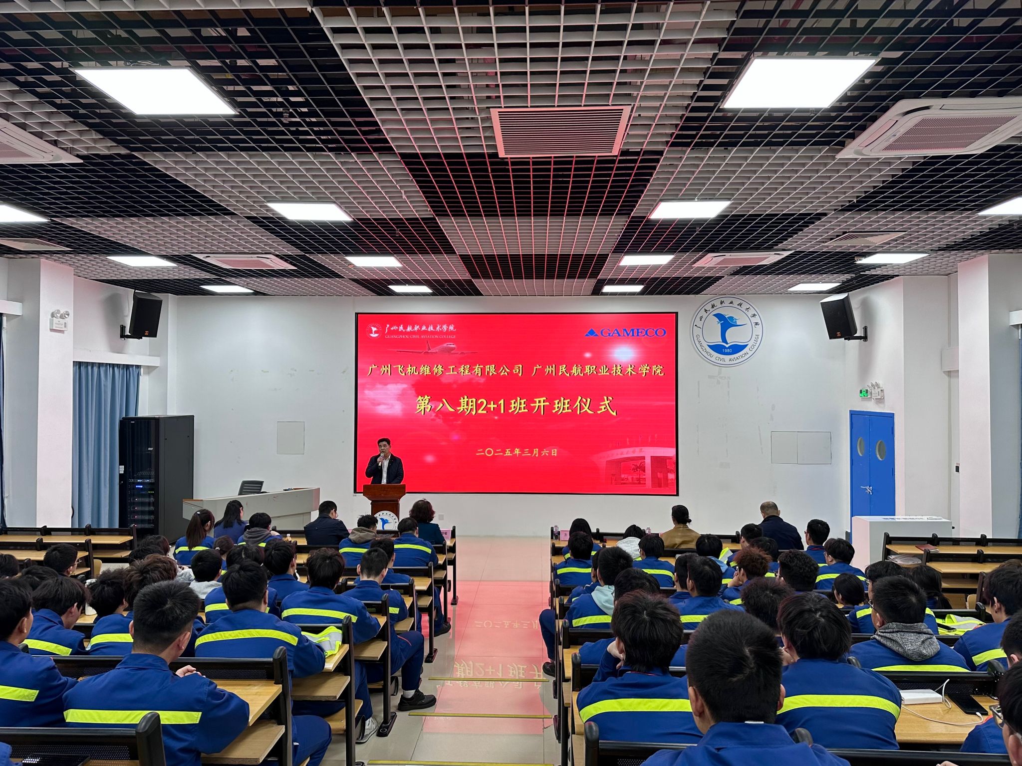 3月6日下午,由广州民航职业技术学院与广州飞机维修工程有限公司(以下简称GAMECO)共同举办的联合培养项目——第八期GAMECO“2+1项目”冠名班在白云机场校区举行开班仪式。GAMECO人力资源部陈倩敏总监、人力发展处秦仪经理、人才渠道管理张梦蝉主任、飞机维修工程学院方松书记、黄白玲副院长等相关领导出席开班仪式。开班仪式由飞机维修工程学院陆轶副院长主持。
