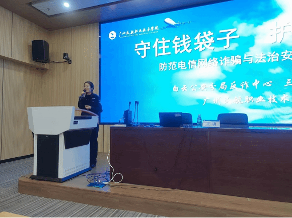 3月13日,学校邀请白云公安分局反诈中心、三元里派出所、三元里街道办在机场路校区阶梯一教室开展了以“守住钱袋子 护住幸福家”为主题的防范电信网络诈骗宣讲活动,机场路校区150余名师生代表参与了活动。