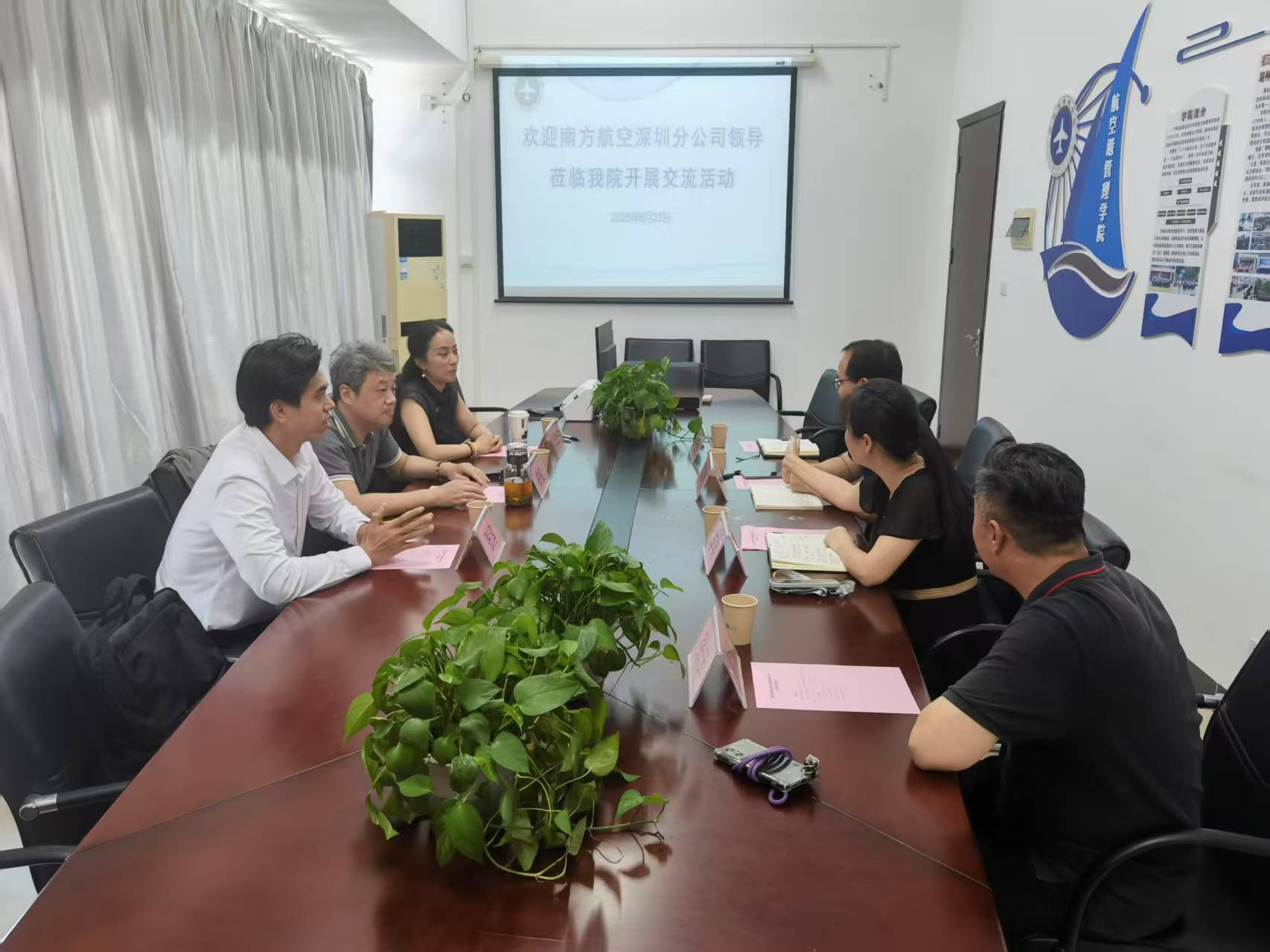2025 年 6 月 23 日上午,南方航空深圳分公司地面服务部柏俊书记、张忆宁主管及人力资源部张淳主管一行莅临航空港管理学院,就校企合作、实习生培养等重要议题开展深入交流座谈。学院领导高度重视此次交流,有关领导和老师热情接待了南航嘉宾,双方在友好、务实的氛围中展开深入探讨。