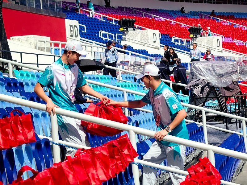 与台前光彩相映的,是39名看台志愿者、109名中场与外场指引志愿者的默默付出,他们分散在场馆各处,承担着重要的保障任务。在正式上岗前他们历经了4—5场全要素实战演练以及多轮专项培训、场地踏勘和物资准备工作,对岗位职责和应急处置流程了然于胸。空中乘务学院的39名看台志愿者,主动学习并熟练掌握了节奏鼓掌、手势舞以及主题曲舞蹈。当音乐响起,他们化身热情的引领者,用极具感染力的笑容和动作,有效调动全场观众的情绪,共同将现场的欢乐与激情一次次推向高潮,成为开幕式上当之无愧的“气氛担当”。航空港管理学院的109名中场与外场指引志愿者,负责物资运输和指引工作,既保障了观众礼包的数量正确、物品齐全、包装完好,还投身于观众指引、欢迎欢送、礼宾带的摆放与收回,有效维护了观众进场退场的秩序。