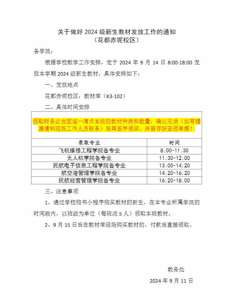关于做好2024级新生教材发放工作的通知 (赤坭校区)