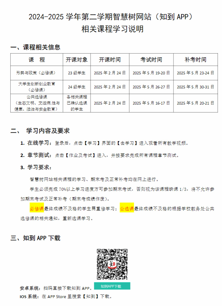 2024-2025学年第二学期智慧树网站(知到APP)相关课程网络学习说明