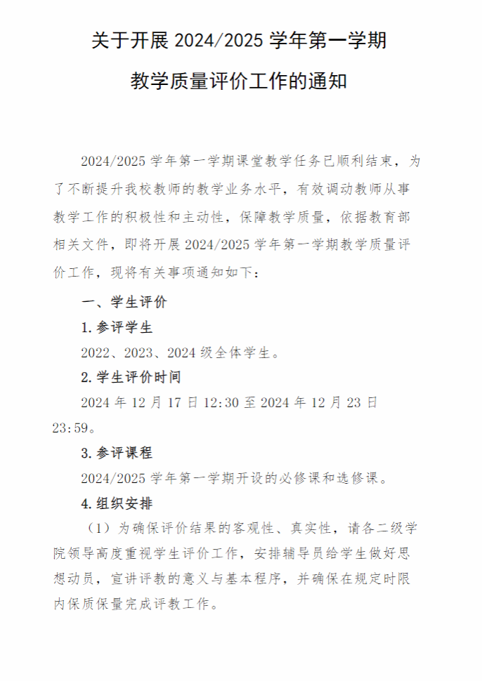 关于开展2024-2025学年第一学期教学质量评价的通知