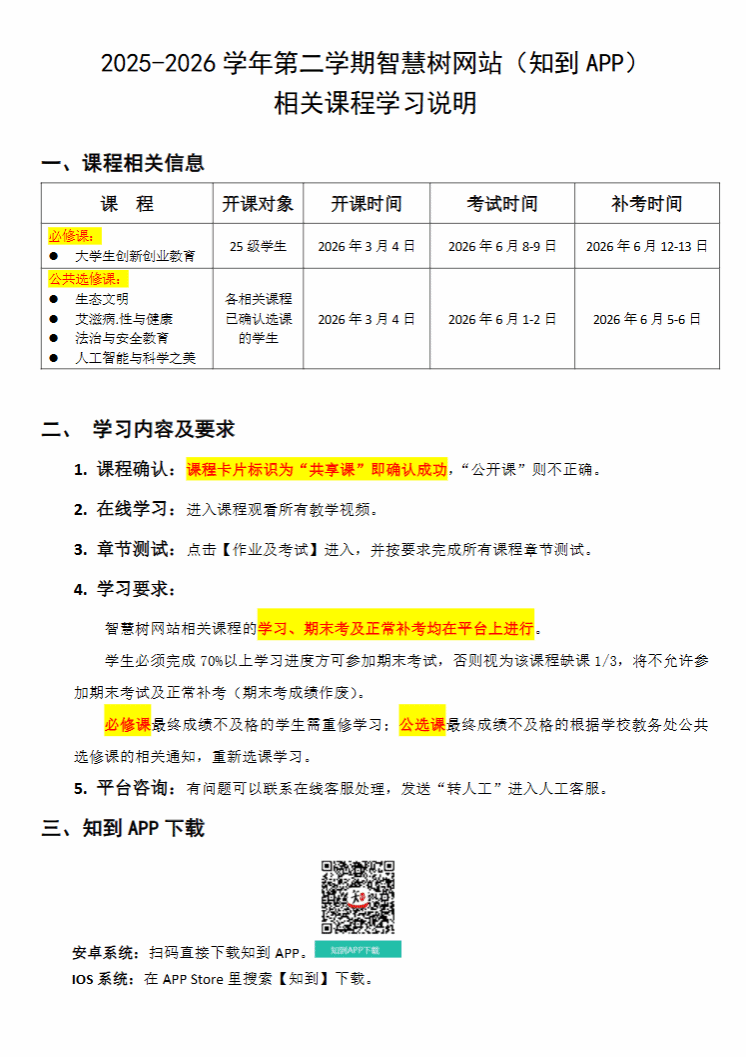 2025-2026学年第二学期智慧树网站(知到APP)相关课程网络学习说明