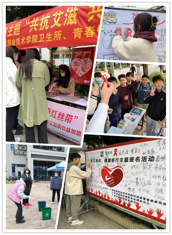 机场路校区青春健康同伴社在校道设立了活动摊位,通过签名墙、答题问卷等方式普及关于艾滋病相关知识。同时线上参与了由广州市疾控中心主办、广东省外语艺术职业学院承办的“2022年广州民航职业技术学院艾滋病防治情景剧+微电影+同伴教育+专家讲座活动”。通过线上线下结合的方式让关“艾”走进校园,共同建立起预防艾滋病的决心。