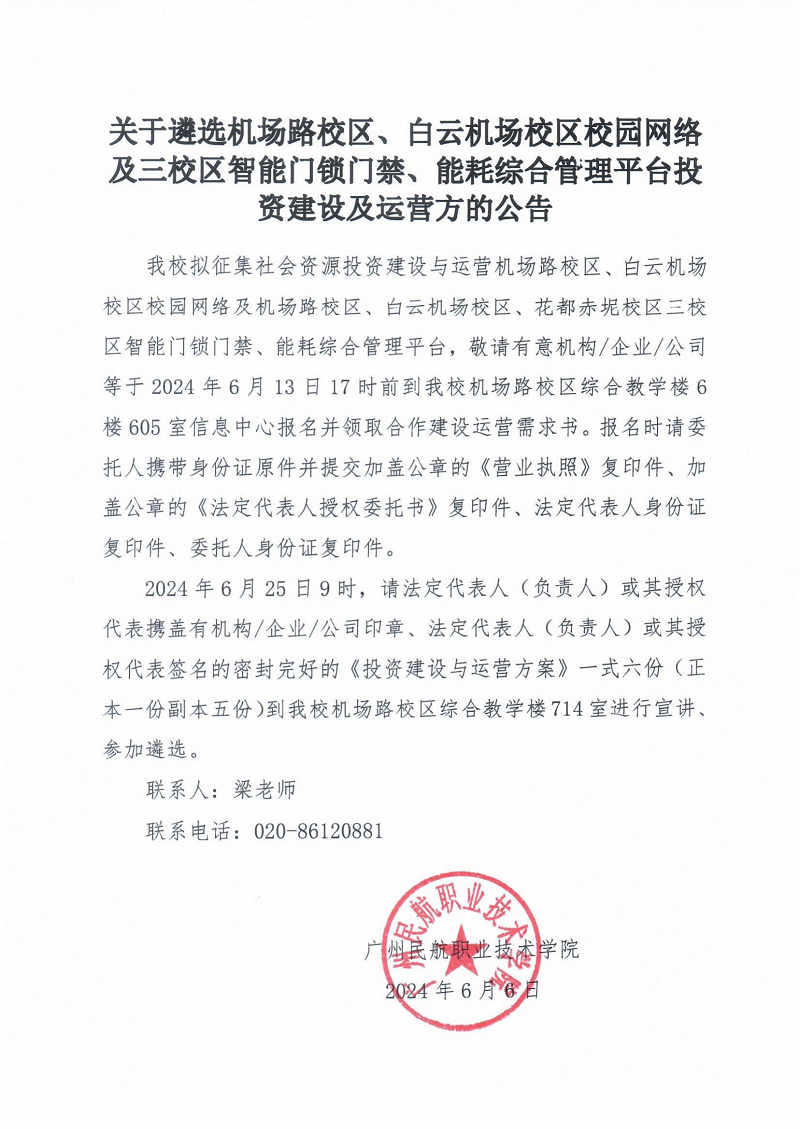 关于遴选机场路校区、白云机场校区校园网络及三校区智能门锁门禁、能耗综合管理平台投资建设及运营方的公告