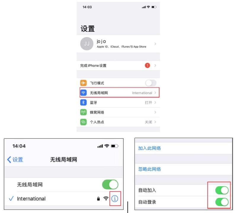 苹果手机需要把WIFI自动加入、自动登陆功能打开,否则会出现WIFI自动断开。