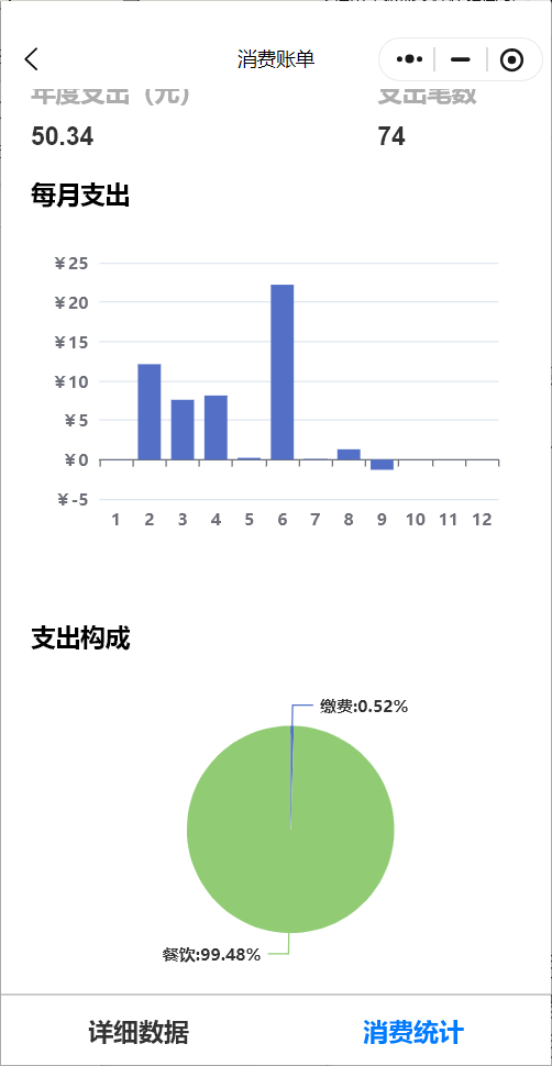 [消费账单]:点“消费账单”可以查看消费记录以及消费分析如图6: