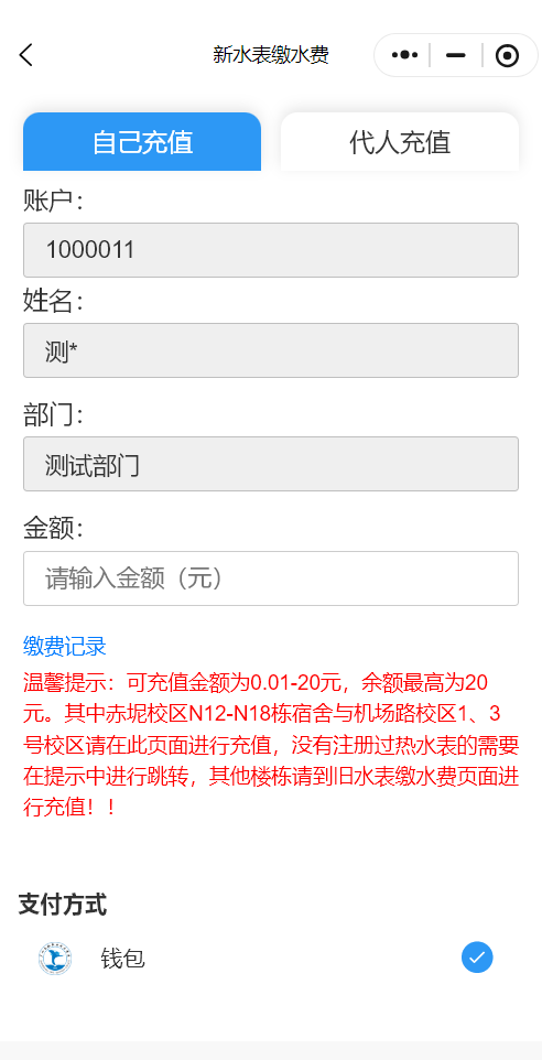 [热水充值]:入住机场路校区、实训基地校区、赤坭校区N1-N11的宿舍,从“热水充值”进入充值界面(如下图12),录入金额,选择支付方式,输入支付密码即可缴费。