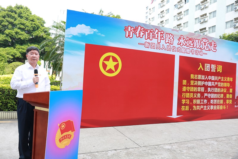 最后,解根怀校长发表题为《勇担时代大任 书写青春华章》的讲话。首先他向各位新团员表示了热烈的祝贺并对青年们寄语了殷切的希望。在中国共青团迎来成立100周年之际入团,是同学们人生旅途中一个重要的里程碑,也是成长道路上的一个新起点,更是政治生命的起航点。校长从无信仰不青春、无书籍不青春、无奋斗不青春、无热血不青春四个维度指引同学们要珍惜国泰民安的难得机遇,珍惜大学殿堂的美好时光,珍惜稍纵即逝的青春年华。随后他提出了四点希望,与广大团员青年共勉,一是希望广大团员青年志存高远、不忘初心,努力做党的事业接班人;二是希望广大团员青年热爱学习、提升素质,努力做堪当重任的栋梁之材;三是希望广大团员青年勇担时代大任,书写青春华章,努力做开拓奋进的引领者;四是希望广大团员青年敬业奉献、开拓进取,努力做建设祖国、建设民航的生力军。并向同学们介绍了学校“13455”发展战略及2022年工作总体思路,他表示学校将牢牢把握新班子、新思路、新希望,秉承校因生而存的理念,关心关注关怀同学们的成长成才成功,不遗余力地办好“五满意”大学,为同学们逐梦蓝天插上钢铁翅膀,不负岁月不负卿。同时,勉励青年学子要牢牢把握新形势、新要求和新机遇,勇于承担时代赋予的光荣使命,以奋勇向前的姿态争做新时代我校高质量发展的见证者和建设者!