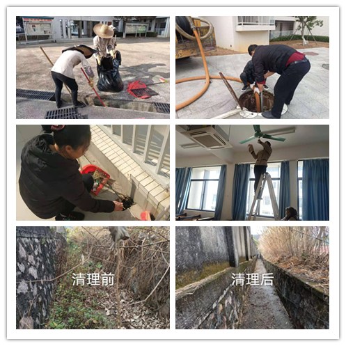 后勤管理处根据学校《关于做好寒假期间各项工作的通知》的内容,认真研究部署,利用假期时间组织物业、绿化管养人员,联合开展环境卫生全面整治工作。一是全面排查,不留死角。1月22日,对花都赤坭校区校园环境卫生进行了全面摸查,掌握了水渠、下水道、化粪池等详细情况。二是科学分工,严格标准。物业根据实际情况,将有关人员分为三组,分别负责水渠、下水道、排水沟等疏通工作,并提出明确具体的要求和完成时限。三是彻底整治,不留隐患。后勤处人员深入一线,组织物业人员铲除水渠两边垃圾、枯树枝、杂草、渠底淤泥;逐个清理被堵塞的排水孔、下水道;清理卫生死角,保障在春季强降雨来临时各水渠均能畅通无阻、及时排涝。