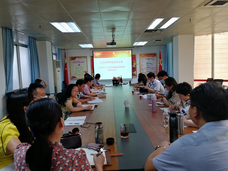6月23日下午,人文社科学院党总支部召开了2021年上半年党风廉政建设形势定期分析会。学校党委徐戊填副书记、纪检监察处许明奭科长、学院党总支部支委、学院领导、下设党支部支委、党政办与教务办负责人、党群工作助理等参加了会议。会议由党总支部徐佩安书记主持。