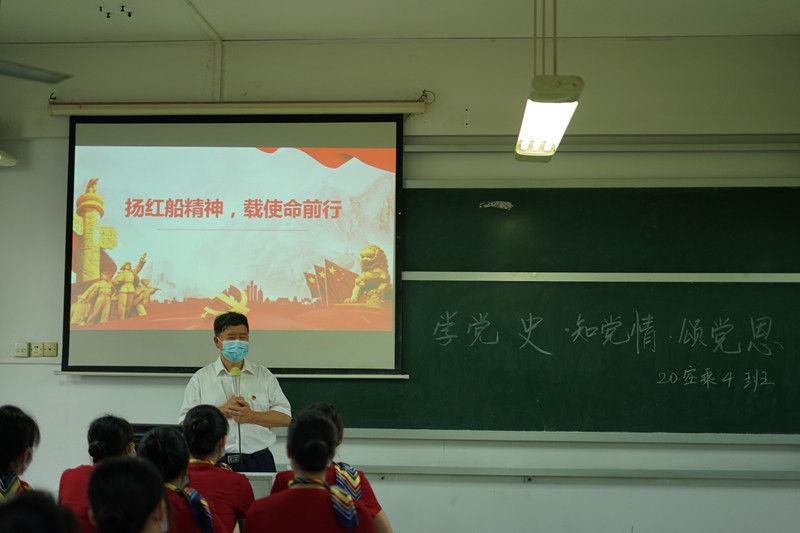 随后,解根怀副校长结合班会中讲到的抗疫先锋和抗疫故事,以党史为切入点,阐述中国共产党始终坚守为人民谋幸福、为民族谋复兴的初心和使命,为学生讲授了主题为《扬红船精神,载使命前行》的思政课。他从“中国共产党创立的历史背景”“党的一大的胜利召开”“红船精神提出和内涵”以及“当代大学生应继承与弘扬红船精神”四个维度进行讲授,内容丰富,生动不失幽默,借助古往今来的案例让学生对党史有了更深入的理解。他叮嘱学生牢记“人民航空为人民,我学航空为人民”的使命,不负韶华,多读书、读好书;深入理解空乘职业内涵,牢固树立“安全第一”思想,积极参加第二课堂活动,提升综合素质能力,以适应职业需求,在微笑蓝天岗位中各尽其能;以学为基,践行当代民航精神,增强“三个敬畏”意识,争做政治合格、思想过硬、纪律严明、作风扎实、素质优良、身心健康的准民航人。