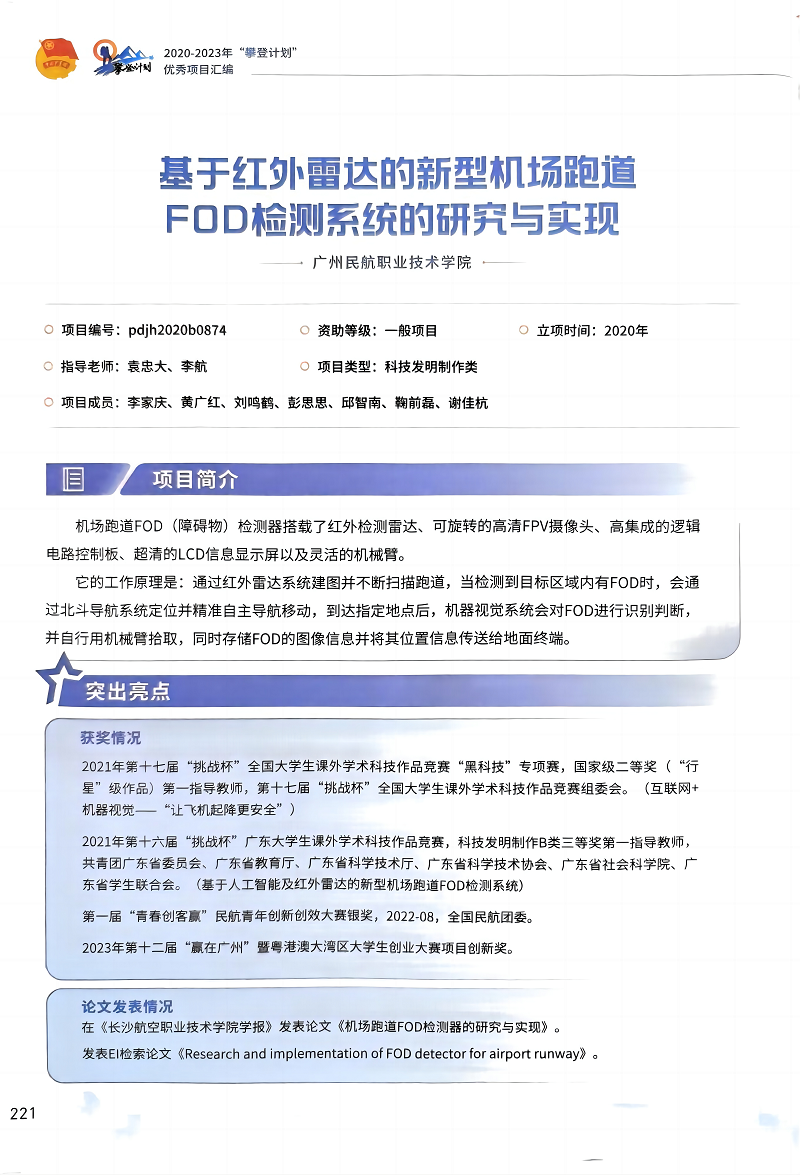 近日从团省委获悉,我校飞机维修工程学院创新创业实验室成果入选《2020-2023年“攀登计划”广东大学生科技创新培育专项资金优秀项目汇编》(全省本专科院校仅102个项目入选,我校入选一项),入选成果为实验室2020年获立项的广东省“攀登计划”项目——基于红外雷达的新型机场跑道FOD检测系统的研究与实现(pdjh2020b0874),项目负责人为2020级飞机机电设备维修专业6班学生李家庆,指导教师为袁忠大副教授。