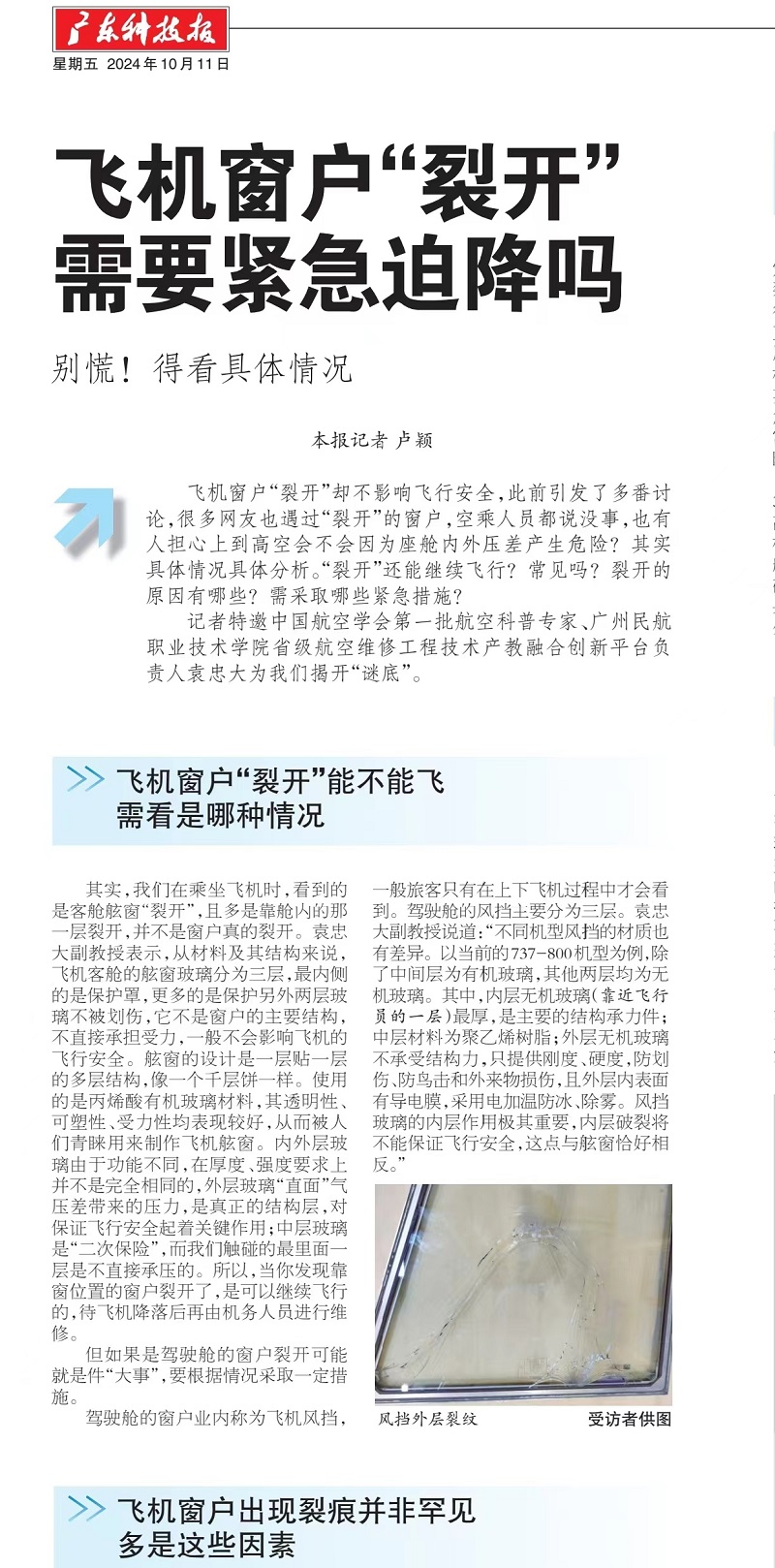 近日,我校飞机维修工程学院袁忠大副教授以中国航空学会第一批航空科普专家、我校省级航空维修工程技术产教融合创新平台负责人的身份接受了《广东科技报》记者的专访,就飞机舷窗及风挡系列航空科普问题进行了详细解答。