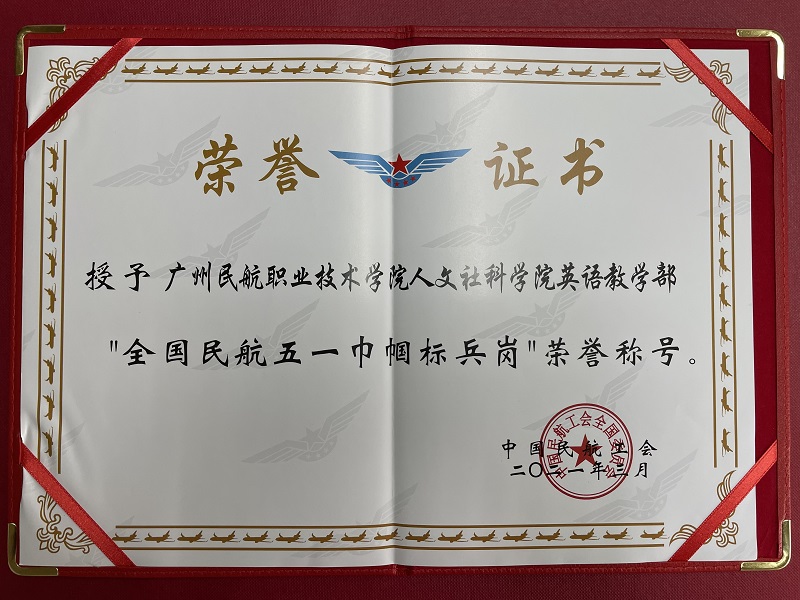 近日,中国民航工会全国委员会发布《关于表彰全国民航五一巾帼标兵(岗)的通报》,对今年来以实际行动在推动民航高质量发展和民航抗击疫情中扛起巾帼担当的先进集体和先进个人予以通报表彰,其中,广州民航职业技术学院人文社科学院英语教学部荣获“全国民航五一巾帼标兵岗”称号。