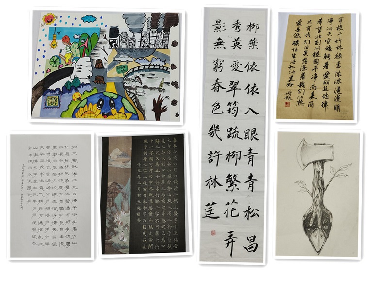 此次活动面向花都赤坭校区全体学生进行作品征集,旨在提高学生环保意识和展示学生书画才华。征集作品既要充分展现节能环保的深刻内涵,又能展现书法、绘画的艺术魅力。形式上可以采用古今诗词、名言警句、对联、赋、格言等,也可自作诗词,或自由绘画作品。经组委会评选,20级货邮四班张煜堃绘画《伐木》、19旅检3班豆增龙书法《校园之美》等10位同学作品获奖。这些获奖作品充分表达了对校园的热爱,也深刻阐明了爱护环境的重要性,发人深省,令人印象深刻。