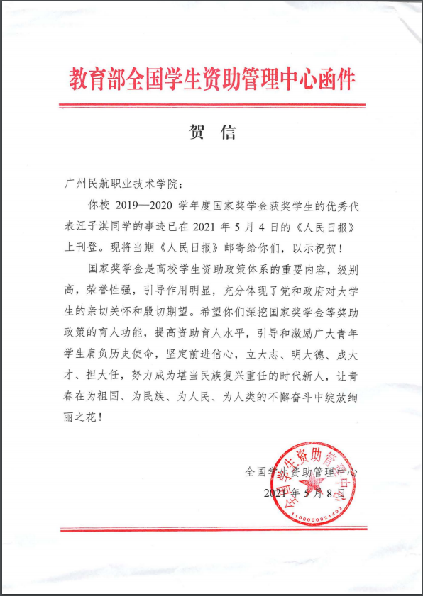 教育部全国学生资助管理中心向我校发来贺信