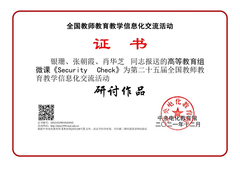 银珊老师与张朝霞副教授、肖华芝副教授组成团队的作品《Security Check(安全检查)》参加该次交流活动。该作品是我校《航空服务英语口语》课程的重要内容,作品内容设计巧妙,教学活动安排有序、高效,教学效果突出。