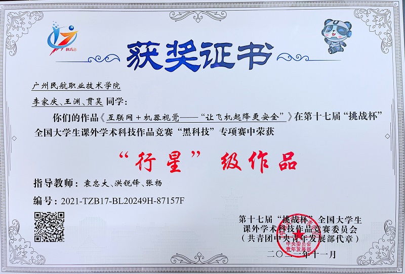 近日,从团省委获悉,我校参赛作品《互联网+机器视觉—“让飞机起降更安全”》在第十七届“挑战杯”全国大学生课外学术科技作品竞赛“黑科技”专项赛中获得“行星级”作品。该作品由飞机维修工程学院李家庆、王渊、贯昊3位同学共同完成,袁忠大、洪锐锋、张杨担任指导老师。