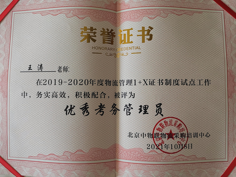 我校因组织物流管理1+X证书培训及考试工作表现优秀,务实高效,积极配合,近期被北京中物联物流采购培训中心授予2019-2020年度物流管理1+X证书制度试点模范考核站点,王涛老师被评为优秀考务管理员。