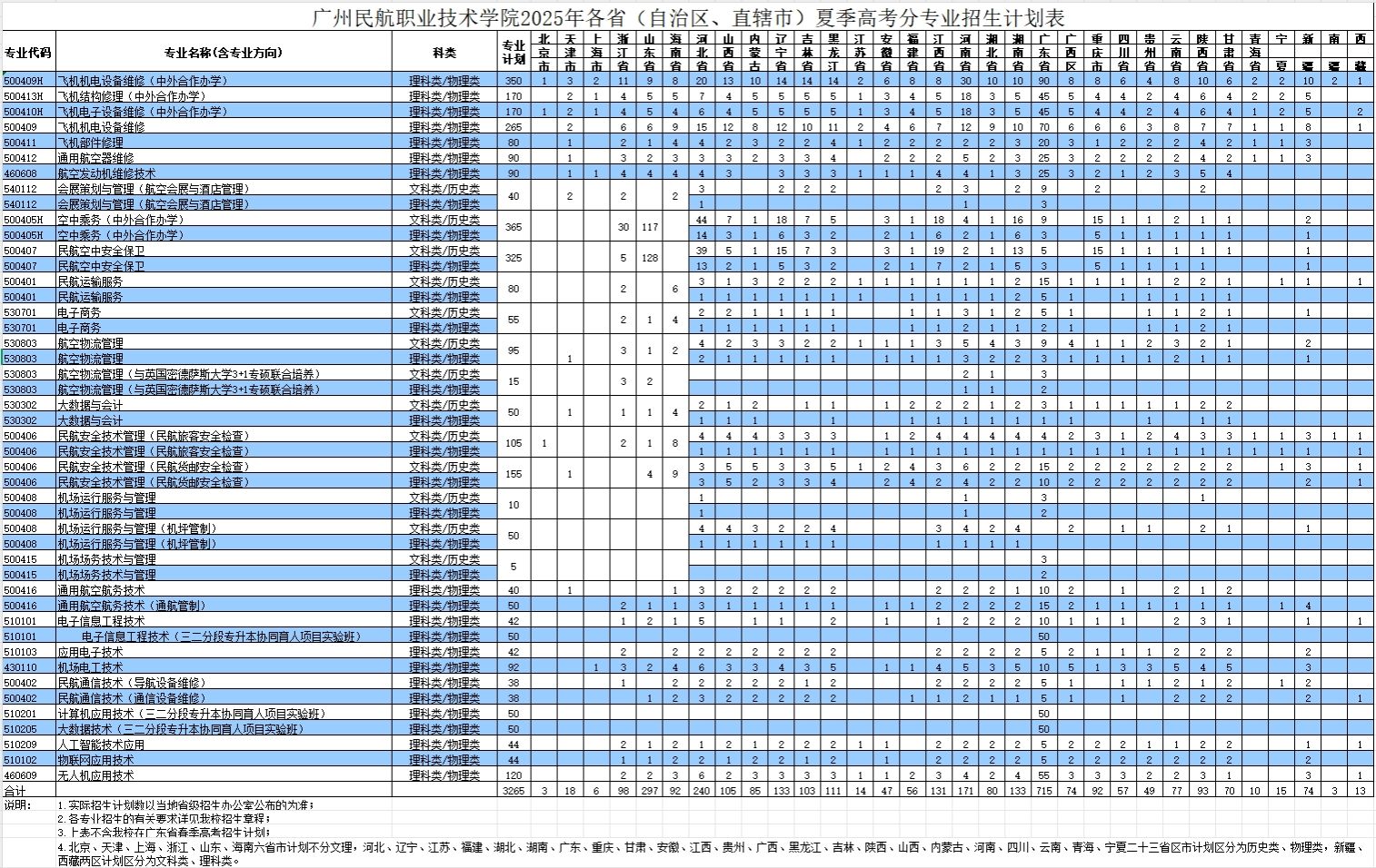 广州民航职业技术学院2025年各省(自治区、直辖市)夏季高考分专业招生计划表