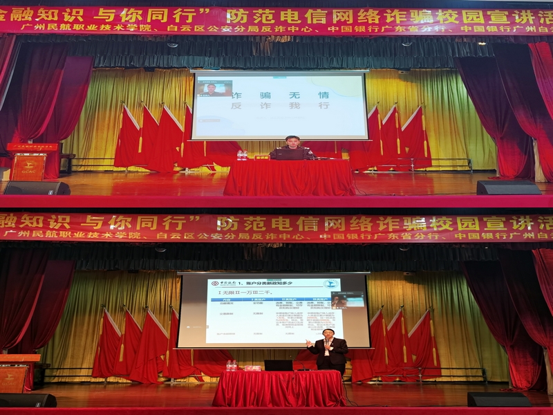 盛开的鲜花与三月撞了个满怀,阳光正好微风不燥,但每年的开学季,却是电信网络诈骗的高发季。3月22日,学校联合白云公安分局反诈中心、中国银行白云支行,在机场路校区百汇楼五楼学术报告厅开展了“金融知识 与你同行”防范电信网络诈骗宣传活动,机场路校区42个班级,1400余名学生线下线上同时参与了活动。