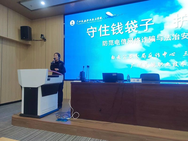 3月13日,学校邀请白云公安分局反诈中心、三元里派出所、三元里街道办在机场路校区阶梯一教室开展了以“守住钱袋子 护住幸福家”为主题的防范电信网络诈骗宣讲活动,机场路校区150余名师生代表参与了活动。