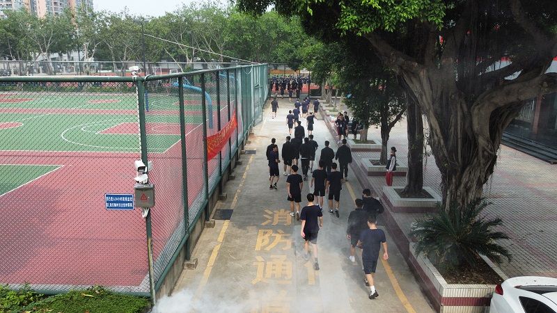 本次活动分为理论培训和疏散演练两部分,理论培训通过直播授课的形式,向师生普及了消防法律法规,讲解了生活中常见火灾隐患排查与防范,演示了火场逃生的正确方式和动作要诀,以及如何正确使用灭火器材扑灭初起火灾。理论培训结束后,随着模拟警报的鸣响,火灾疏散逃生演练正式开始,同学穿过浓烟,按照计划路线,有序地从各自所在宿舍迅速撤离到田径场集合列队,并在培训教官的指导下,逐一进行了模拟火场烟道逃生体验。