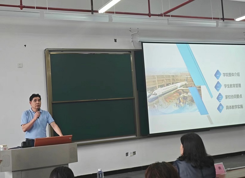 新生家长会上,学院领导对2023级新生家长和新生们表示热烈的欢迎,随后,详细介绍了飞机维修工程学院的基本情况,从学院发展情况、学科建设水平、师资队伍、课程设置、教学实践、人才培养及实习就业等几方面作深入全面地讲解,充分展示了学院的整体风貌,帮助家长对自己孩子的学校、专业和未来职业发展有更清晰的了解。
