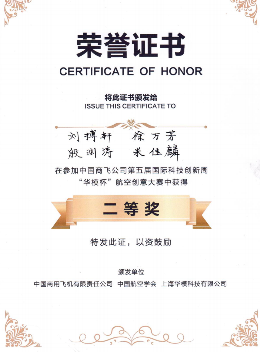 决赛中,我校参赛队伍经过自我介绍、作品介绍、回答专家提问等环节,对参赛作品《下一代先进宽体干线客机“风鹏”设计梗概》进行了全面的展示,最终获得团体第三名的好成绩,荣获二等奖。此次比赛指导教师为袁忠大老师,参与学生为我校飞机维修工程学院刘搏轩、米佳麟等同学,我校为第一参与单位。