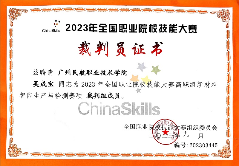 9月20日—25日,2023年“中银杯”全国职业院校技能大赛(高职组)新材料智能生产与检测赛项在河北石家庄河北工业职业技术大学举行。广州民航职业技术学院飞机维修工程学院飞机结构修理专业带头人吴成宝教授受邀担任此次大赛转炉智能铜冶炼(火法)、带钢热轧仿真操作及安全技术、金相检测、锂离子电池性能检测四个模块裁判。在担任裁判期间,吴成宝老师秉承公正、公平、专业的原则和三不三保(不引导、不误导、不吓唬;保条件、保纪律、保沟通)的工作方法开展评判工作,圆满完成大赛的执裁工作。