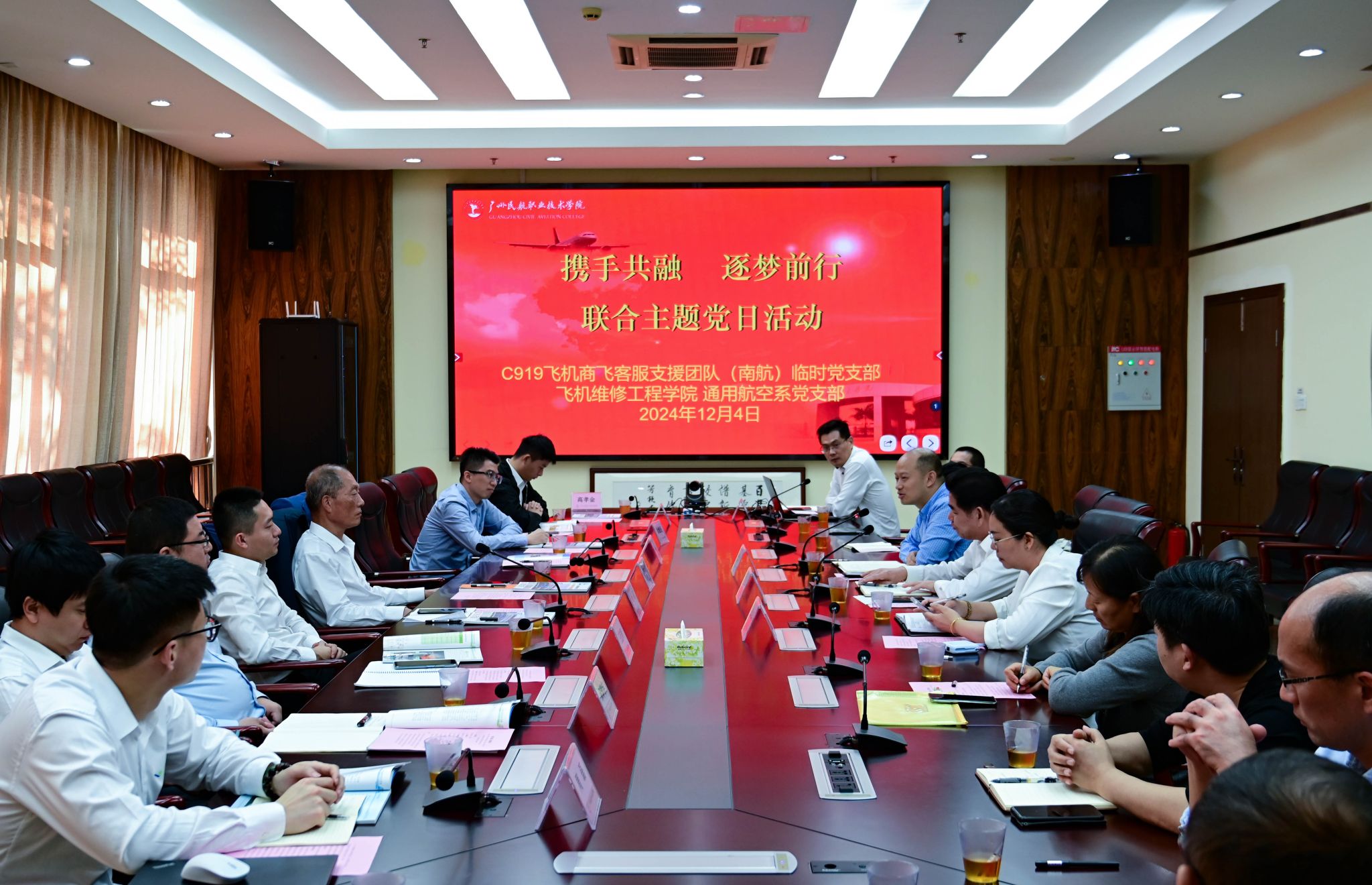 为深入贯彻新时代党的建设总要求,加强党支部间的交流和学习,促进校企深度合作,推动双方党建和业务工作互联互动,提升党支部党建工作水平与党建品牌建设,12月4日下午,飞机维修工程学院通航党支部与商飞C919飞机商飞客服支援团队(南航)临时党支部在白云机场校区105会议室开展了支部结对党建共建活动,实现支部之间资源共享、优势互补、互相促进、共同提高。飞机维修工程学院党总支部方松书记、黄白玲副院长、陆轶副院长、通航党支部覃智勇书记,中国商飞驻南方航空总代表高喜军、C919商飞客服公司运行支持部副部长、临时党支部书记刘伟及双方党员代表共同参加了此次活动。
