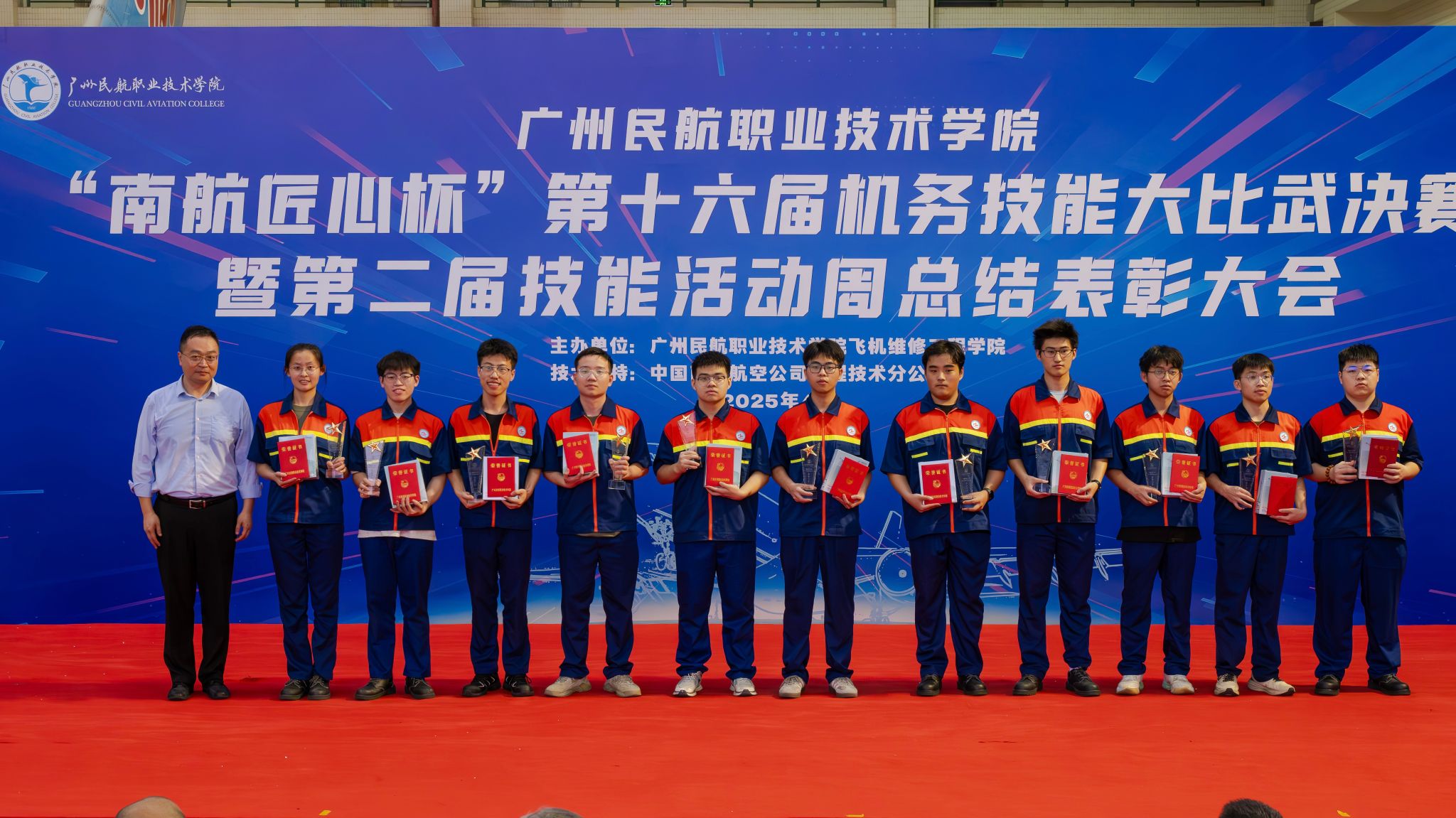 在为期一个月的激烈角逐中,民航学子们展现出令人瞩目的专业素养。机务技能大比武现场,参赛团队在模拟航空器排故环节精准操作,力矩扳手的咔嗒声与工卡核对的口令声此起彼伏;飞机指挥操比赛中,学生化身“航空指挥官”,标准手势与灯光信号配合娴熟,再现了白云机场塔台的真实工作场景;未来飞机设计赛项则涌现出多组融合新能源技术与智能航电系统的创新方案,彰显了民航新生代的科技想象力。最终,本届技能活动周活动共评选出24名学生获得一等奖,45名学生获得二等奖,65名学生获得三等奖,邓君香、周倩雯、吴成宝等28名老师获得优秀指导老师奖,在闭幕式上分别举行了颁奖仪式。