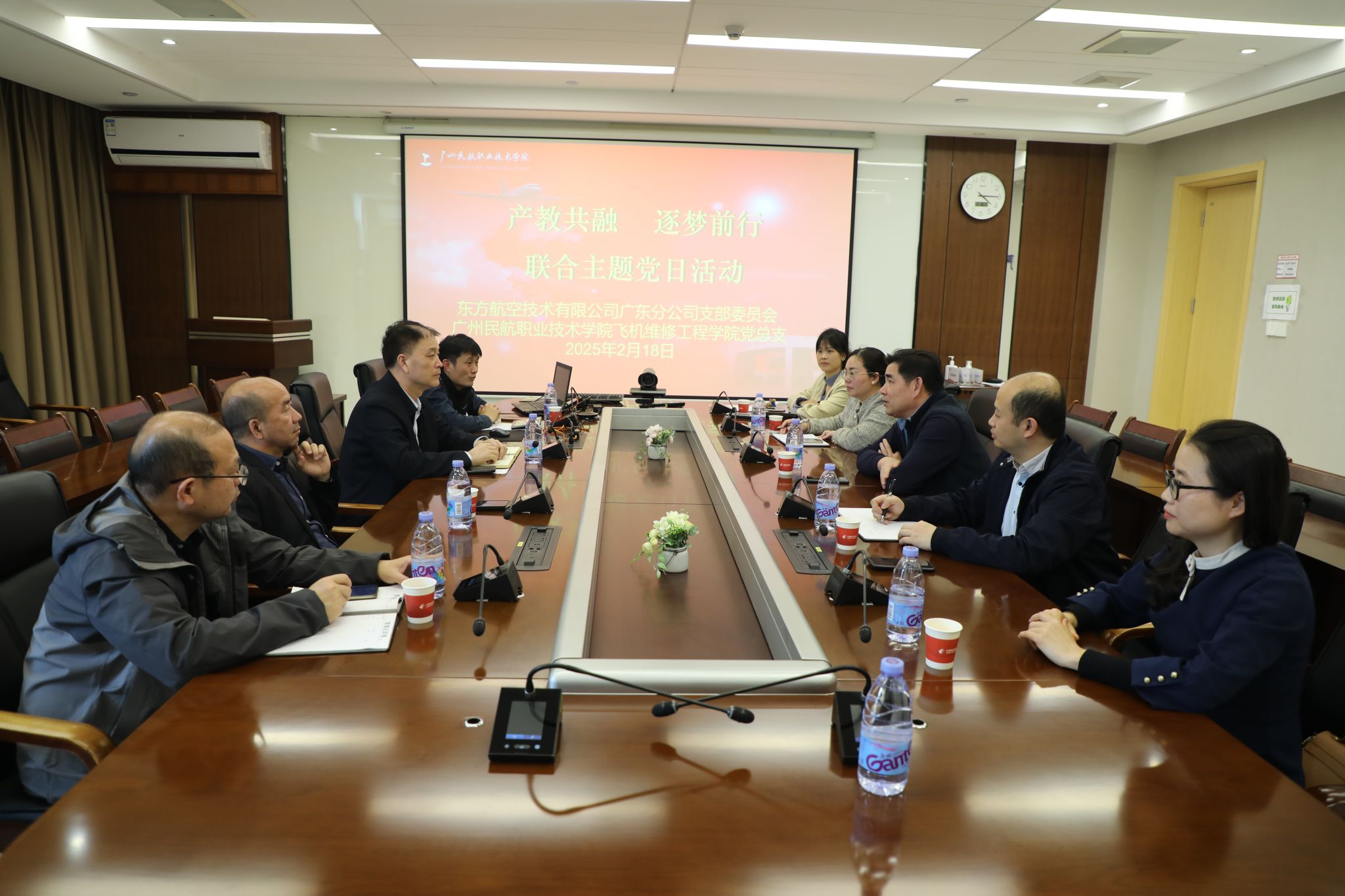 本次联合活动以“产教融合,共赢发展”为主题,在党建共建活动中,双方分别介绍了各自党组织的党建工作特色及经验,并就如何进一步加强校企合作、推动产教融合进行了深入交流。东航技术广东分公司常晋明书记表示,民航维修是保障飞行安全的核心环节,高素质技术技能人才的培养是行业高质量发展的关键,望与学院一道,共同加强对机务学生的培养培训。飞机维修工程学院方松书记在发言中强调,学院始终坚持以行业需求为导向,此次合作将依托东航技术广东分公司的实战平台,在学生就业、党建、竞赛等方面继续拓展校企融合,助力学生实现从“技能生”向“民航工匠”的蜕变。