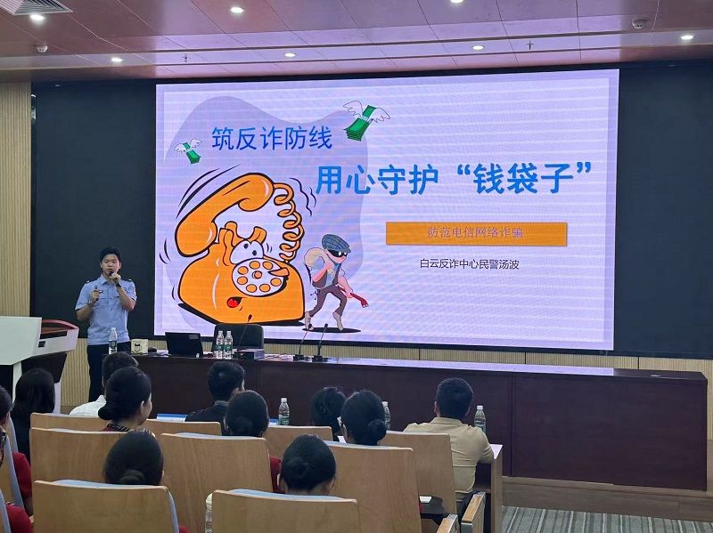 5月21日下午,学校特别邀请棠景街道反诈宣传部、白云反诈中心、三元里派出所、中国银行等专家组成宣讲团,在机场路校区综阶一开展了第二期反诈志愿者专题培训活动,空中乘务学院39个班级,120名志愿者参加了本次活动。