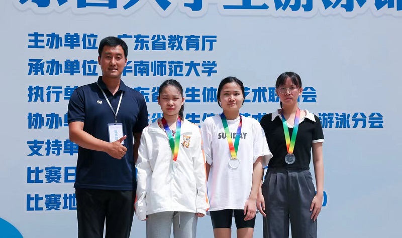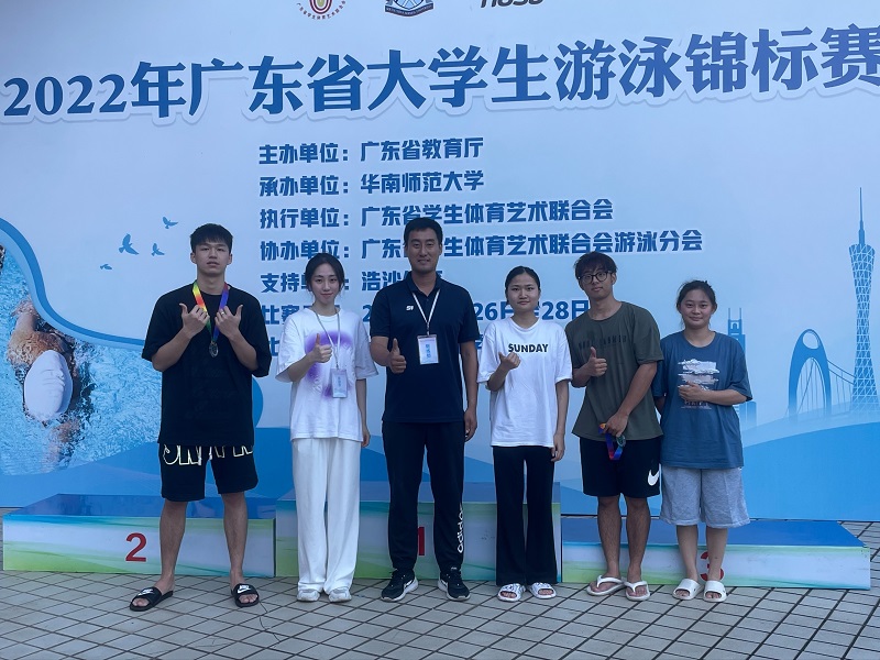 2023年5月26日至28日,由广东省教育厅主办、华南师范大学承办的2022年广东省大学生游泳锦标赛在华南师范大学大学城校区游泳馆隆重举行。我校游泳队获得女子丙组100米仰泳第一等八项佳绩。
