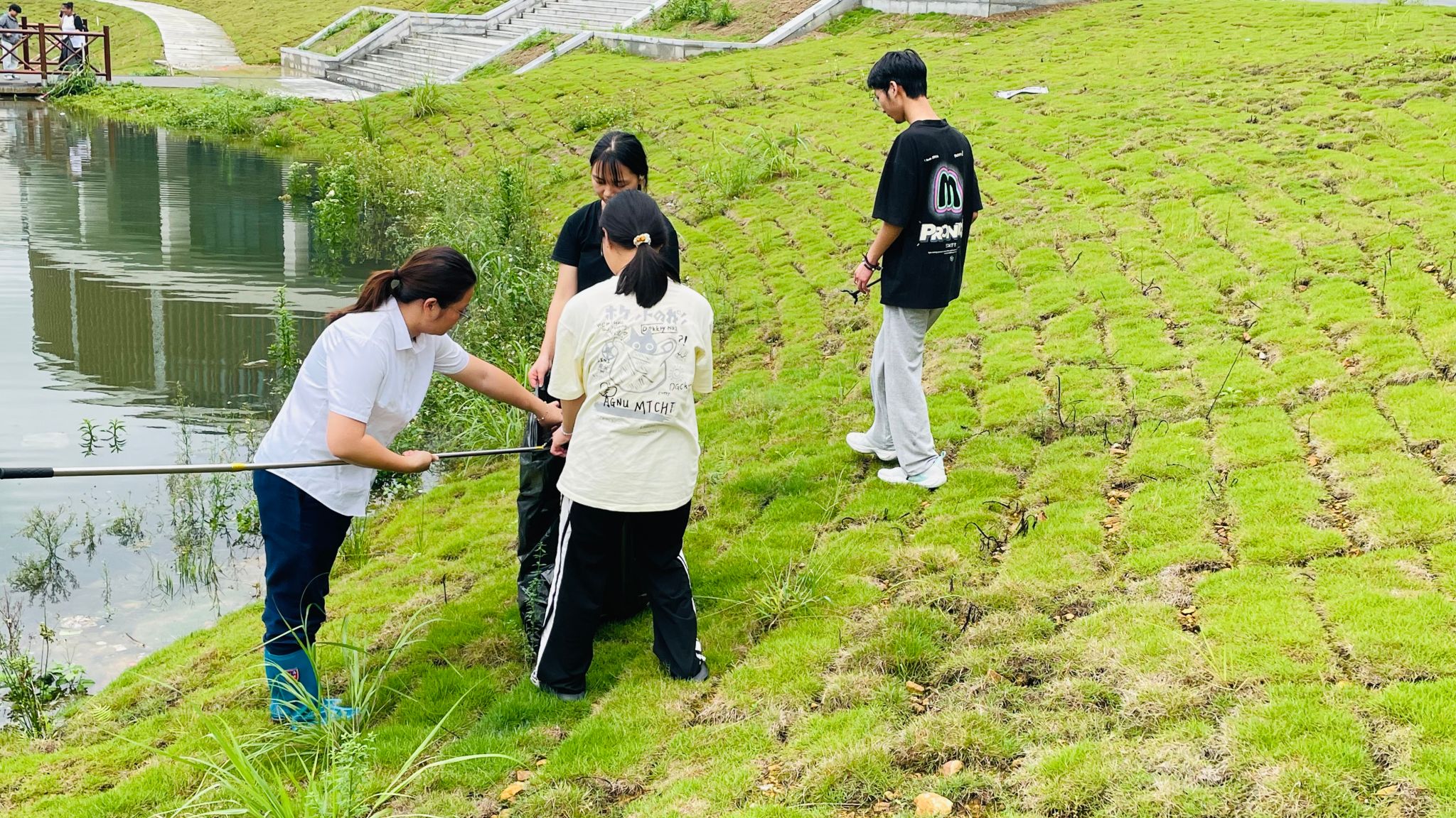 此次清理行动覆盖了人工湖的全域范围,重点针对水面漂浮物以及周边杂草枯枝等问题进行全面清理。活动现场,物业人员配备着各类专业打捞工具,有条不紊地对湖面的落叶、塑料袋、矿泉水瓶等垃圾进行全面打捞。与此同时,30 余名学生志愿者们热情高涨,化身为一个个认真负责的 “护水小卫士”,他们手持打捞工具,分成多个小组积极投身到湖岸垃圾清理工作中,用实际行动诠释着对校园环境的爱护之情。