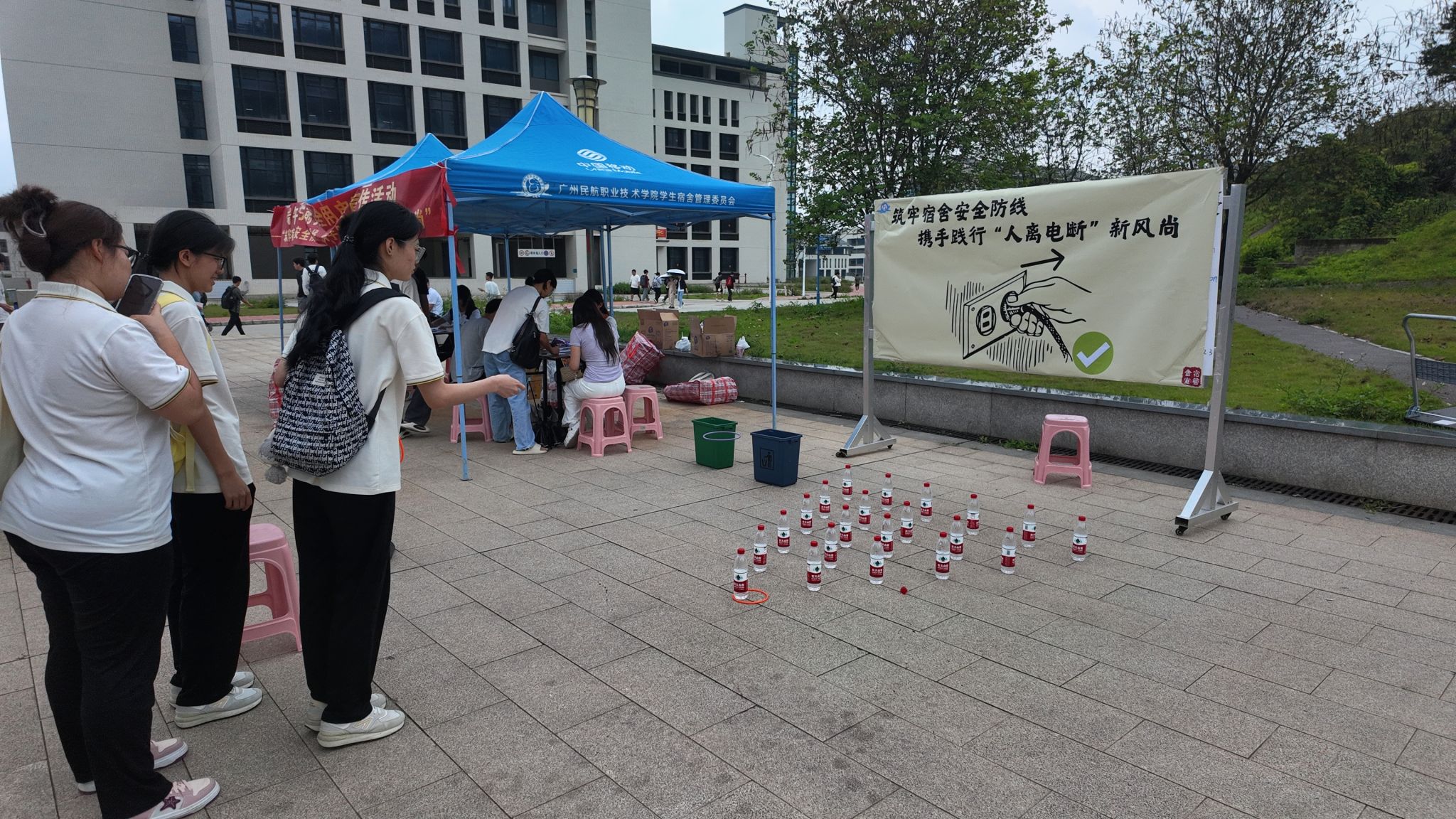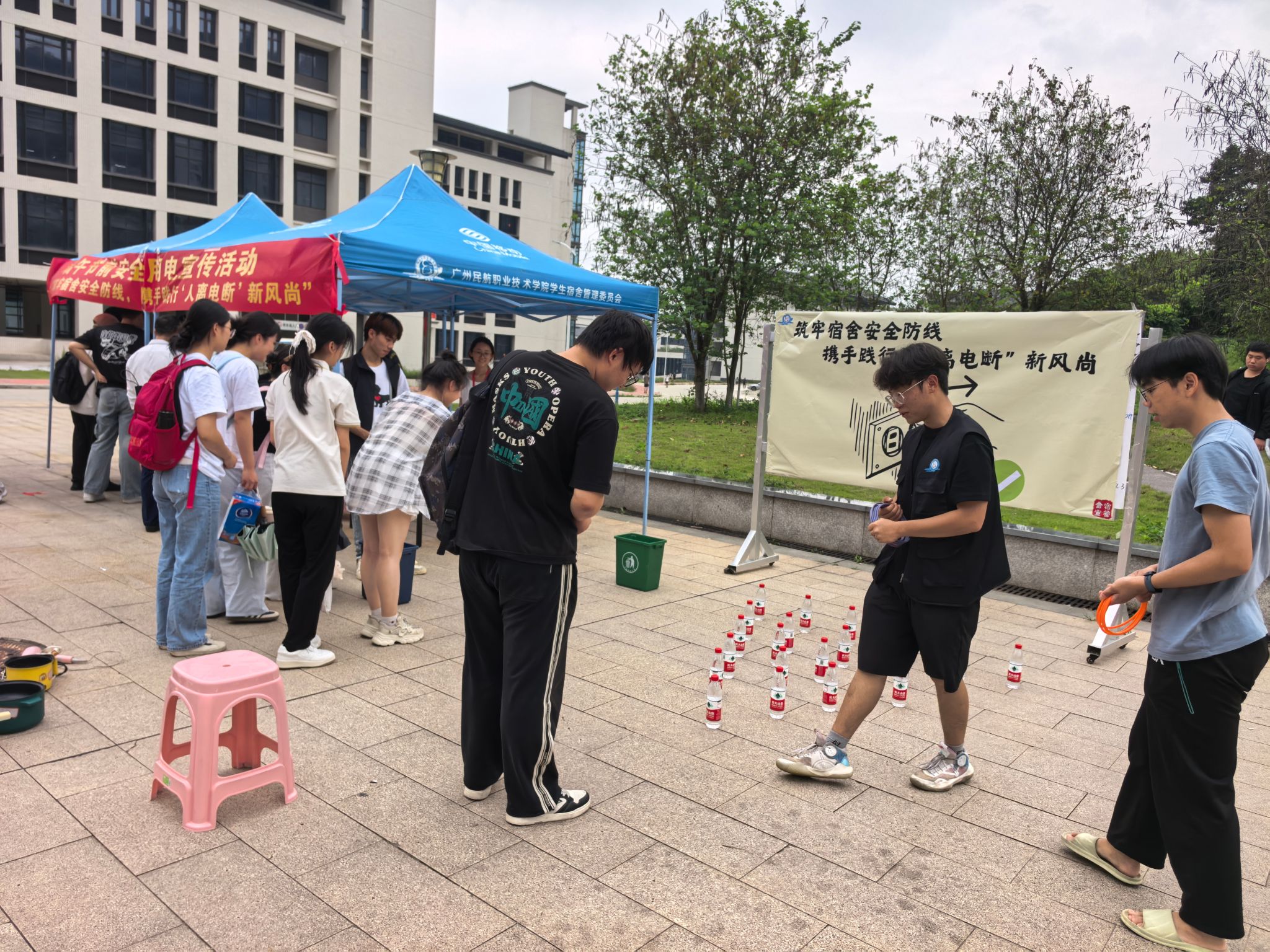 端午将至,为进一步强化学生安全用电意识,有效防范宿舍电器火灾风险,5 月 27 日,后勤管理处学生宿舍管理委员会在赤坭校区食堂小广场举办了以 “筑牢宿舍安全防线,携手践行人离电断新风尚” 为主题的安全用电宣传活动,通过寓教于乐的互动形式,吸引众多学生踊跃参与,反响热烈。
