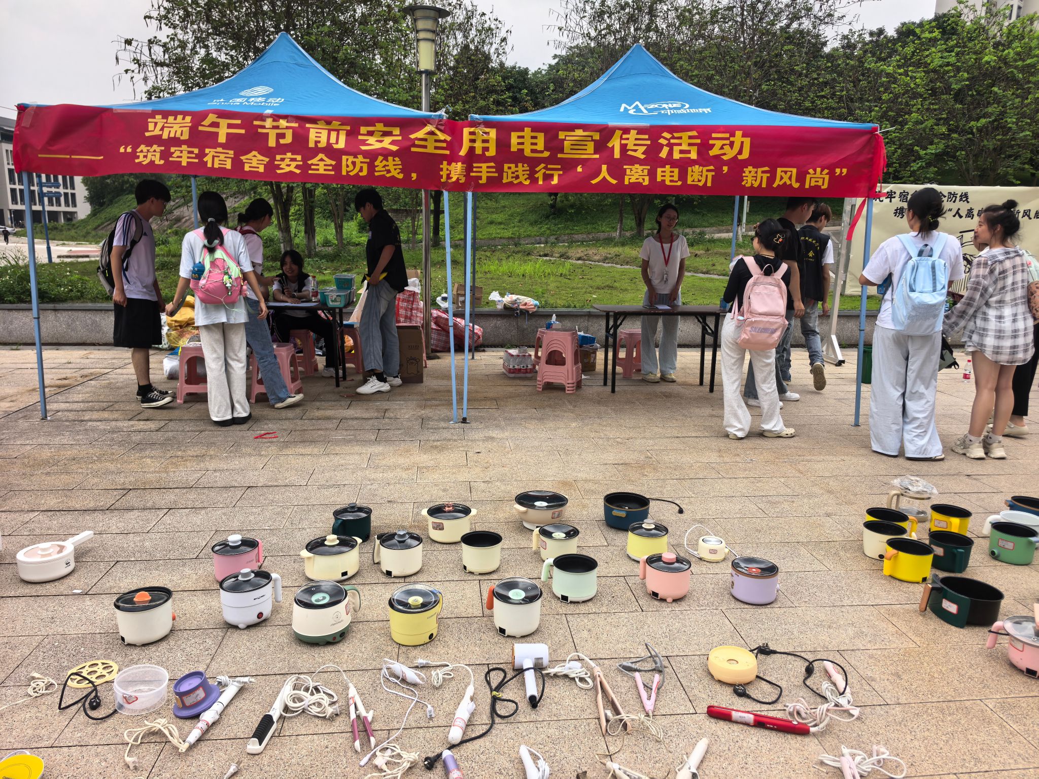 活动现场还设置了主题展板与海报,并摆放了卷发棒、电煮锅、电水壶等上百件大功率电器进行展示,将安全警示融入活动场景中,在学生参与趣味活动的同时,提醒学生远离违规电器用电行为。此外,宿管会同学精心讲解,呼吁学生养成“人离电断”的良好习惯。希望通过这种宣传形式,推动学生从‘被动管理’向‘主动防范’转变,构建学校和学生协同的宿舍安全长效机制。