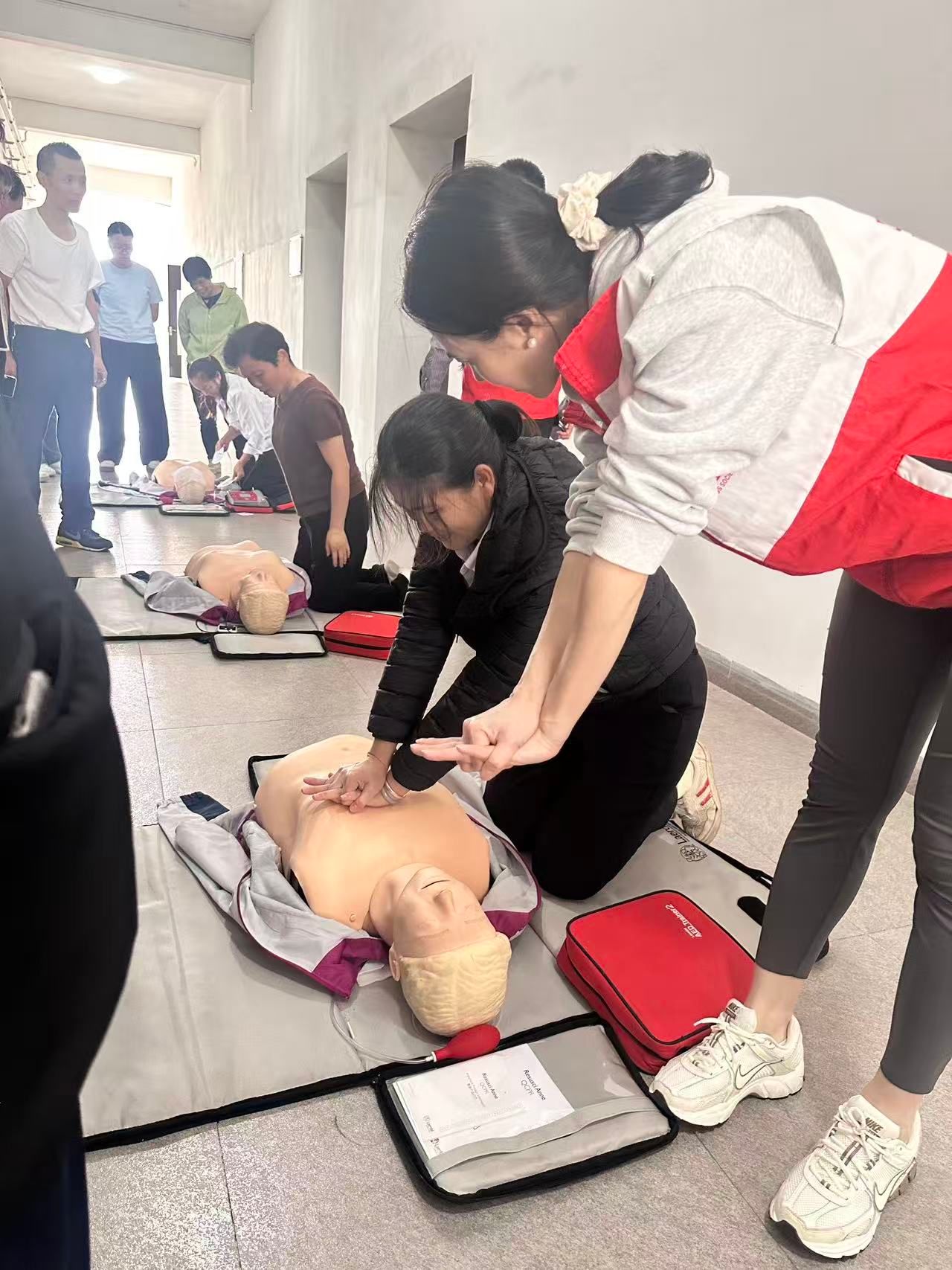 讲师首先强调急救知识对日常生活和突发事件应对的重要性,随后为大家详细讲解了心肺复苏(CPR)及自动体外除颤仪(AED)的使用方法,并进行了现场实操示范,还讲授了海姆立克急救法、创伤包扎等基础救护技能。