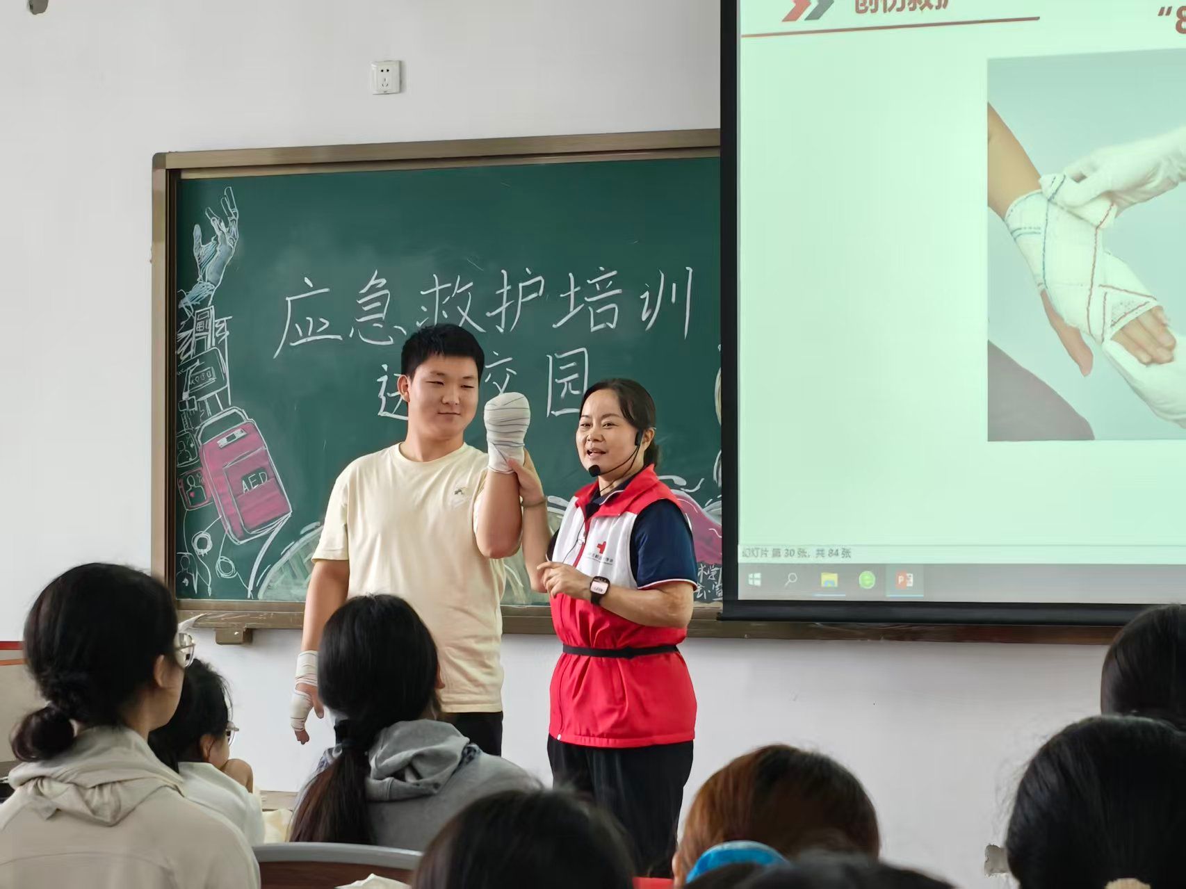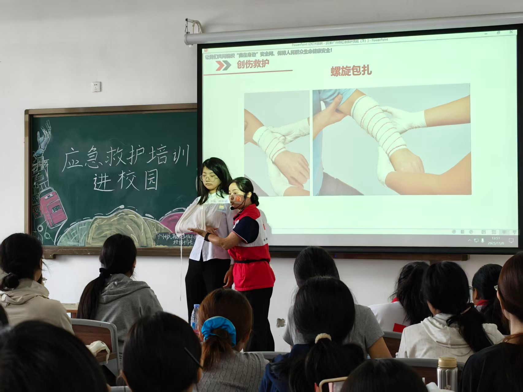 从头部到手臂,从螺旋包扎到“8”字缠绕,讲师一一示范要领。课堂化身为“临时救护站”,同学们互为“救护员”与“伤员”,在亲手实践中不仅掌握了技巧,更体会到急救中不可或缺的共情与关怀。