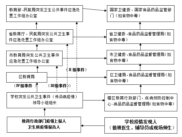 重大(Ⅱ级)突发公共卫生事件发生后,学校可以直接报告省教育厅突发公共卫生事件应急处置工作领导小组办公室和民航局,并同时报告区教育局。