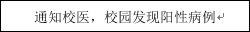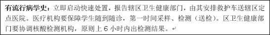 2.校园疫情防控工作专班立即落实工作部署,明确应急处置负责人并向区域应急处置小组(卫生健康部门)报告,积极配合病例转运、消毒、隔离、后勤保障等疫情处置工作。