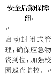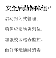 3.安全后勤保障组:提供所需要应急处置的设施、设备和物资,确保应急工作顺利开展。负责保障校内餐饮、生活饮用水。在前期处置过程中,负责现场警戒、秩序维护、人员疏散等。立即启动封闭式校园管理。严格控制外来人员、车辆进入校园,做好在校师生生活保障。必要时,根据卫生健康部门建议,在校内设置集中医学观察场所。加强校园巡查管控,及时停止校园群体性聚集活动,及时处置校园安全突发事件,协助处置涉校舆情事件。