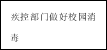 6.消毒组:要在疾控机构的指导下,按国家和省的消毒指引,做好病例所在宿舍(公寓)、教室等疫点、公共场所的清洁、随时消毒和终末消毒。