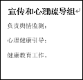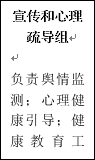 7.宣传和心理疏导组:负责舆情监测和处置、心理健康引导、健康教育工作。疫情期间通过各种渠道宣传新冠防控知识,告知师生一定要正确佩戴口罩,勤用流动水洗手,咳嗽、打喷嚏时使用纸巾并妥当处理废弃纸巾;促进全体师生严格规范个人卫生行为,养成良好的个人卫生习惯。根据确诊病例、疑似病例和密切接触人员等不同群体的实际情况,密切家校沟通合作,有针对性地开展心理支持和危机干预工作;稳定家长和师生的情绪,避免过度恐慌和舆情的发生。