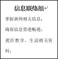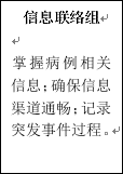 2.信息联络组:掌握病例的活动史、人员接触史,掌握重点人群名单、医学观察人员每日健康情况等信息。负责信息的收集、上报、处理和传递等工作,确保信息上报渠道畅通。负责实时记录突发事件的发展过程,提供真实材料,按规定拟稿上报。