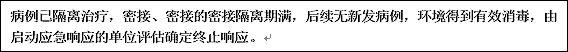 病例已隔离治疗,密切接触者、密接的密接隔离医学观察期满,无新发病例出现,环境得到有效消毒,由启动应急响应的单位评估确定并宣布应急响应终止。