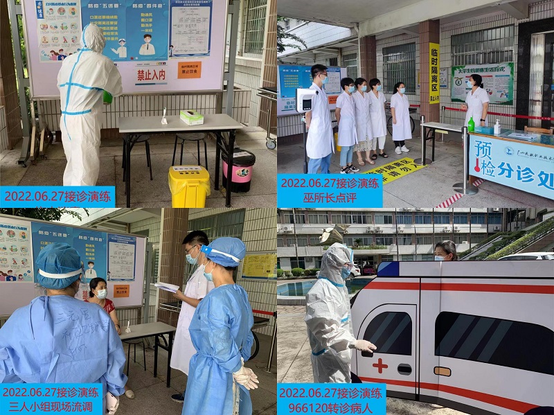 为提高卫生所对新冠肺炎的哨点监测能力,提升医务人员监测意识,做到早发现、早预警、早控制,防止疫情在学校的蔓延。根据区卫生局要求需定期对接诊发热病人进行全流程演练,卫生所于2022年6月27日14:00进行专项演练,机场路校区全体医务人员参加了此次应急处置演练。